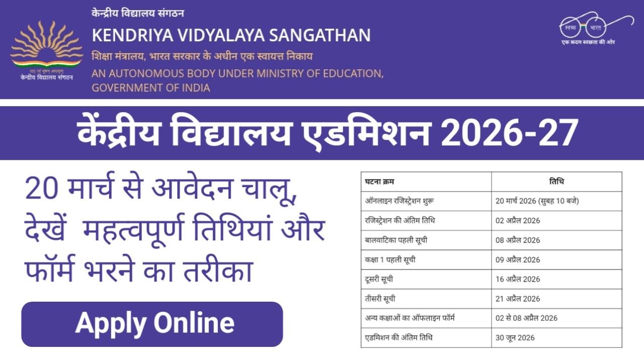 KVS Admission Form 2026: देशभर के लाखों अभिभावकों के लिए बड़ी खबर सामने आई है। Kendriya Vidyalaya Sangathan ने शैक्षणिक सत्र 2026-27 के लिए एडमिशन शेड्यूल जारी कर दिया है। इस बार कक्षा 1 और बालवाटिका (Balvatika 1 & 3) में दाखिले के लिए online registration 20 मार्च 2026 से शुरू हो रहे हैं। अगर आप अपने बच्चे का एडमिशन केंद्रीय विद्यालय में कराना चाहते हैं, तो यह सही समय है।