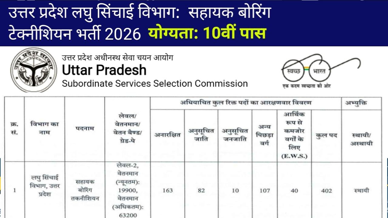 UPSSSC: उत्तर प्रदेश में सरकारी नौकरी (Government Job) की तैयारी कर रहे युवाओं के लिए बड़ी खुशखबरी सामने आई है। उत्तर प्रदेश अधीनस्थ सेवा चयन आयोग (UPSSSC) ने UP Minor Irrigation Department में Assistant Boring Technician Recruitment 2026 के लिए आधिकारिक नोटिफिकेशन जारी कर दिया है। इस भर्ती के तहत कुल 402 पदों पर उम्मीदवारों का चयन किया जाएगा।